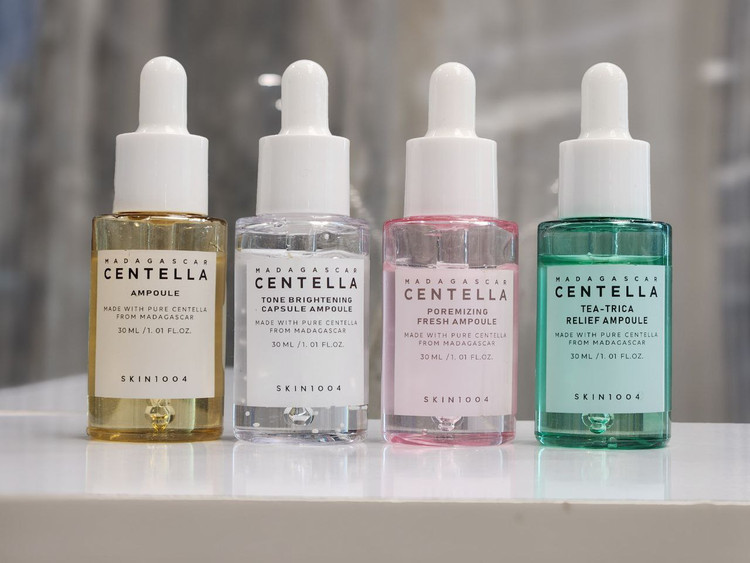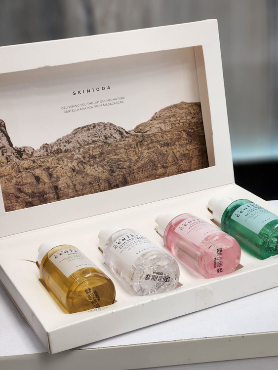 مجموعهای کامل برای مراقبت و بهبود وضعیت پوست کیت حاوی ۴ عددی آمپول ماداگاسکار سنتلا از برند SKIN1004 شامل: