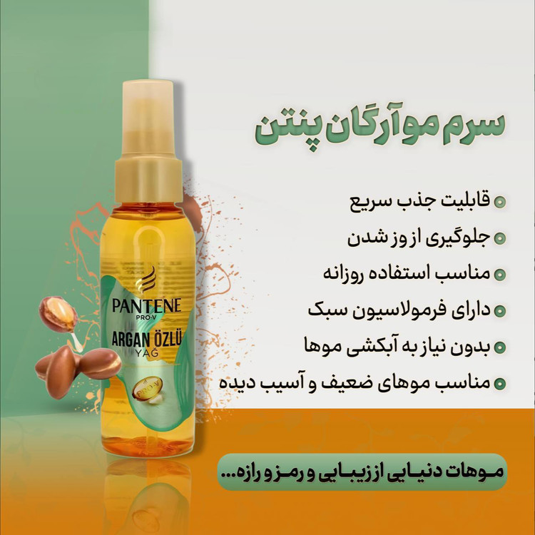 سرم مو آرگان پنتن ترکیبی از روغن آرگان مراکشی و پرو ویتامین است که باعث تغذیه و تقویت کامل ساقه مو می شود .بافت بسیار سبک روغن آرگان مو پنتن باعث می شود سلامتی وشادابی از دست رفته به موهای شما باز گردد و آسیب های متحمل شده مانند رنگ مو، دکلره، فر و یا صاف کردن مو،اثرات سوءِ بارداری و زایمان طبیعی و… از چهره مو زدوده شود و باعث لطافت، شفافیت و درخشان شدن مو می شود . موهای خشک و آسیب دیده خود را به روغن مو پنتن سپرده و اثرات این نرمی و لطافت و درخشندگی را تا 24 ساعت به طور کامل مشاهده کنید. موهایی منعطف و شفاف و از همه مهم تر درمان شده را خواهید داشت.