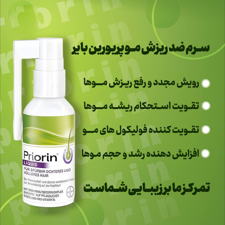 محلول ضد ریزش و تقویت کننده مو پریورین بایر دارای ترکیبات گیاهی و پرو ویتامین B5 بوده که در درمان ریزش مو، رشد مجدد و تقویت مو تاثیر شگفت انگیزی دارد و با تغذیه ی فولیکول های مو منجر به پرپشتی و افزایش ضخامت موها خواهد شد.